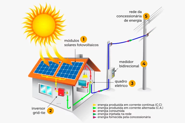 Após a conversão para corrente alternada, a eletricidade solar está pronta para ser utilizada. Ela pode ser direcionada para alimentar diretamente as cargas elétricas em nossas casas e empresas, como eletrodomésticos, iluminação e sistemas eletrônicos. Durante o dia, quando a produção de energia solar é alta, o excedente de eletricidade pode ser enviado para a rede elétrica, gerando créditos energéticos que podem ser utilizados em momentos de menor produção solar, como à noite ou em dias nublados.